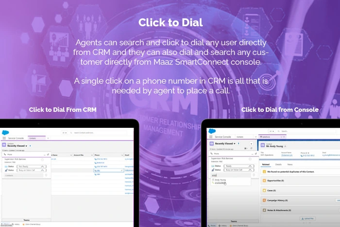 - OneClick solution for agents to call a phone number by a single click once connected to CRM either from CRM and search console