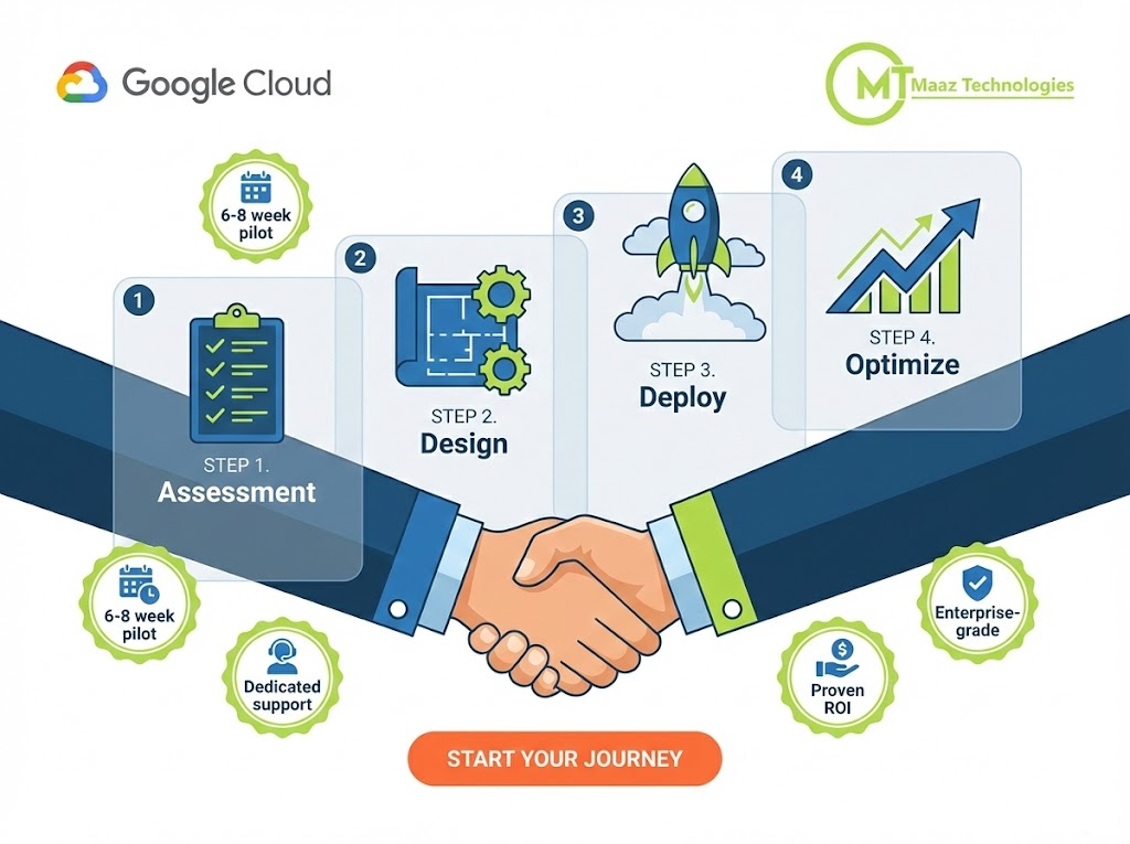 Maaz Technologies partners with organizations to deploy google cloud contact center ai solutions that deliver measurable results. Teams assess current capabilities, design custom solutions, and provide ongoing optimization.Implementation Process: