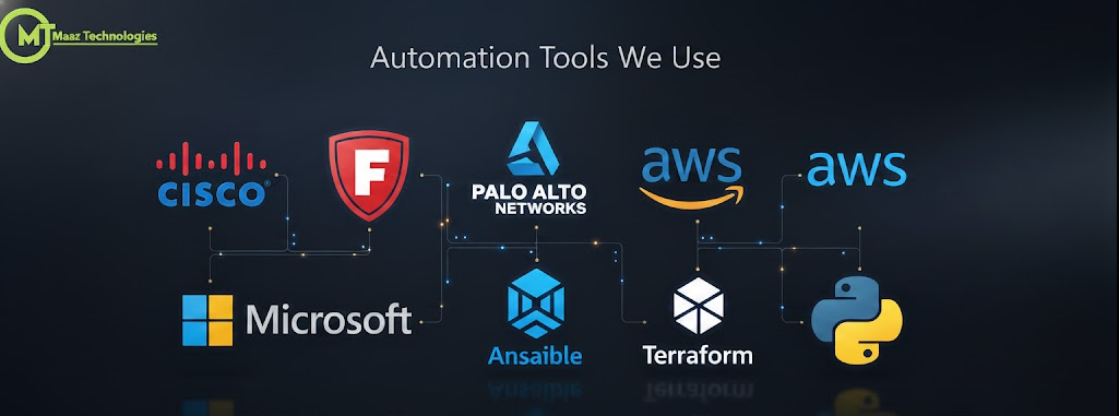 At Maaz Technologies, we combine industry-leading tools with smart engineering to build flexible, secure, and future-ready network automation frameworks. From data centers to hybrid clouds, our technology stack ensures consistent performance across every network layer.Automation Capabilities & Frameworks