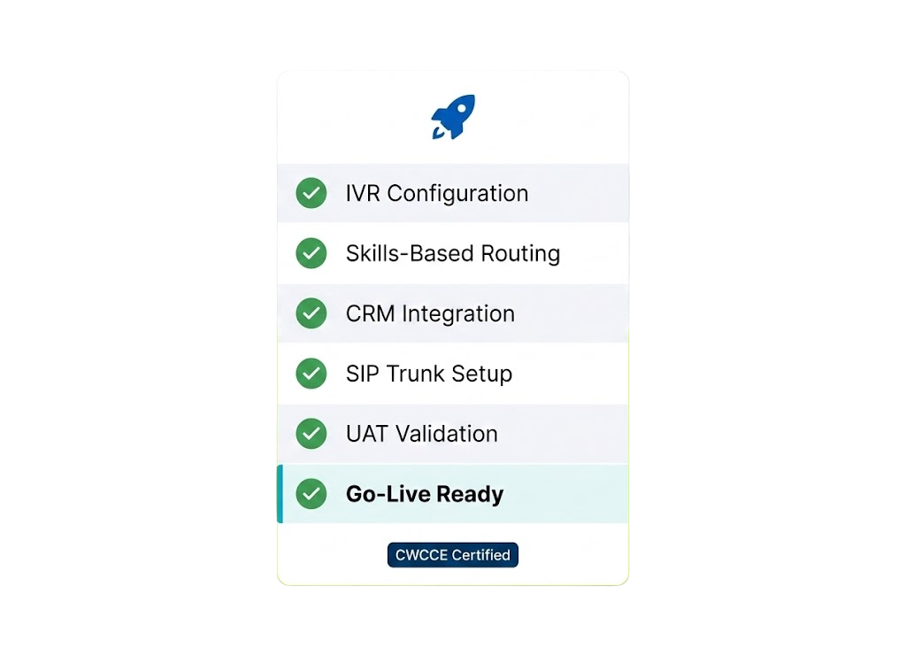 The outcome for enterprise organizations is a contact center deployment that reaches performance targets faster, requires fewer post launch corrections, and provides a stable foundation for the integration, development, and optimization work that follows.